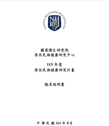 115年度合作計畫「原住民族健康研究計畫」徵求(已結束) 2025 年 8 月 20 日 本次計畫徵求聚焦於原住民族健康議題,旨在提升原住民族整體健康水準,並深入探討影響其健康之社會、文化與結構性因素,以縮短族群間之健康落差。